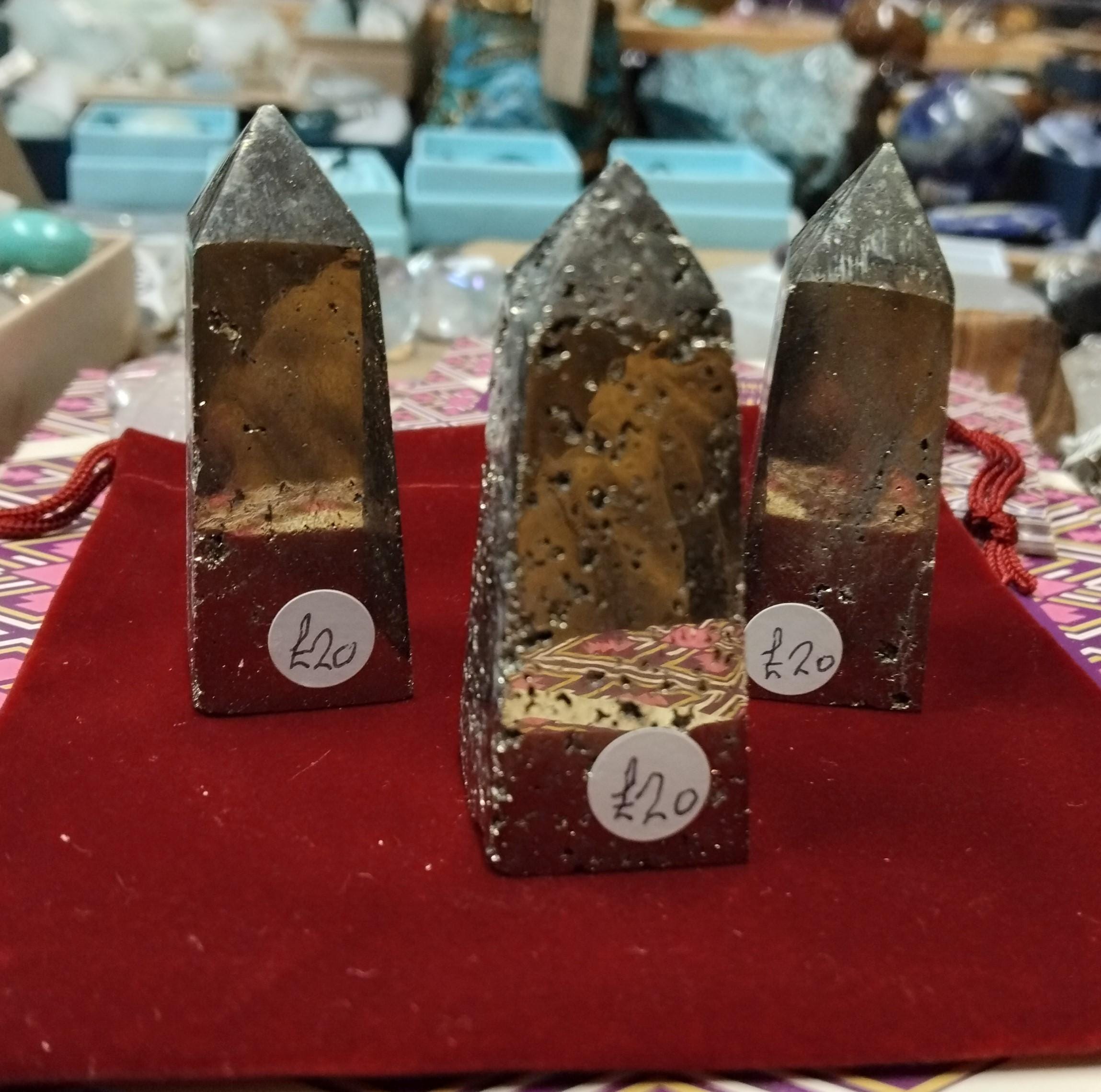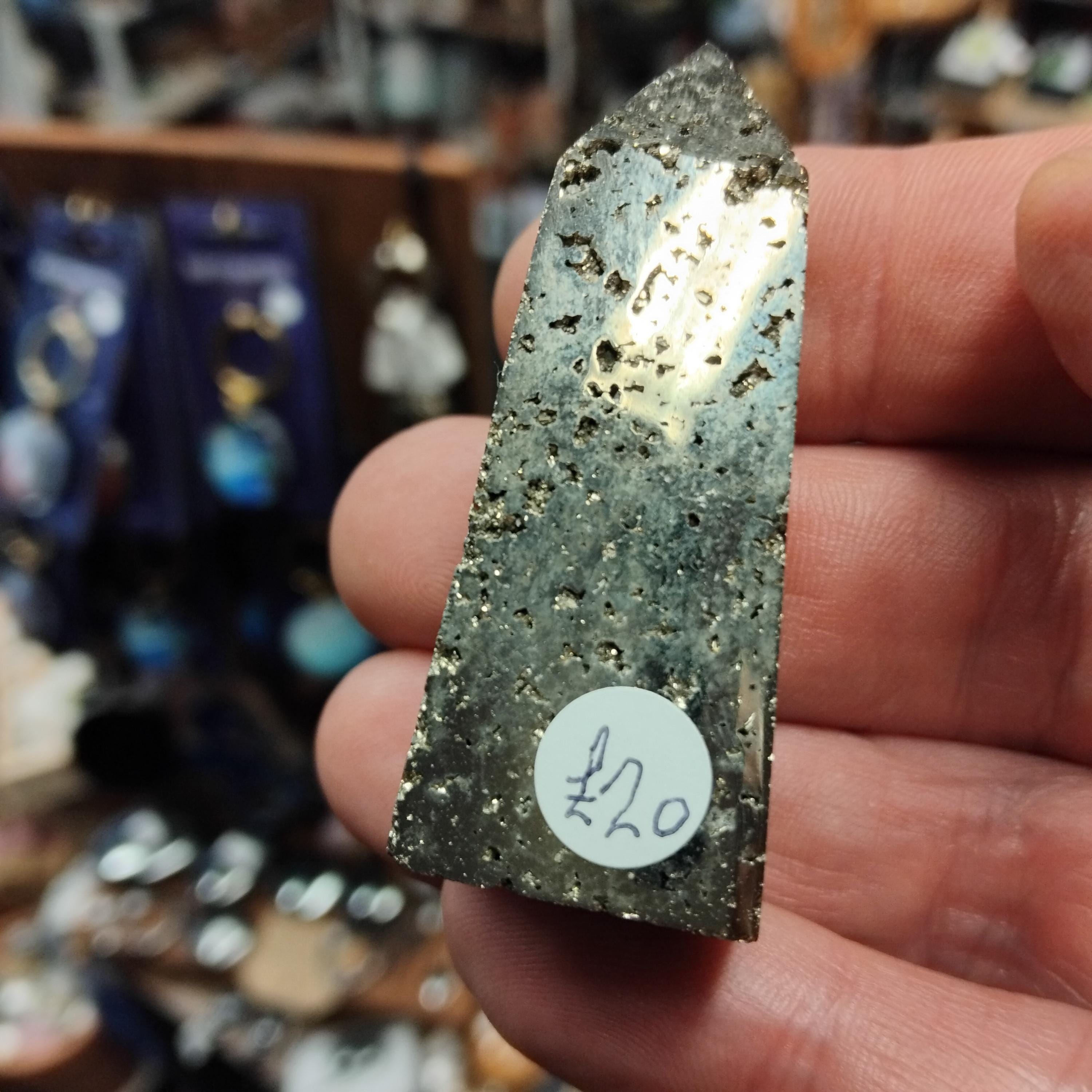 The Iron Pyrite Standing Tower is a small crystal tower made of polished Iron Pyrite, originating from Peru. This unique collectable item features a shape of abundance, making it a striking addition to any crystal or mineral collection.