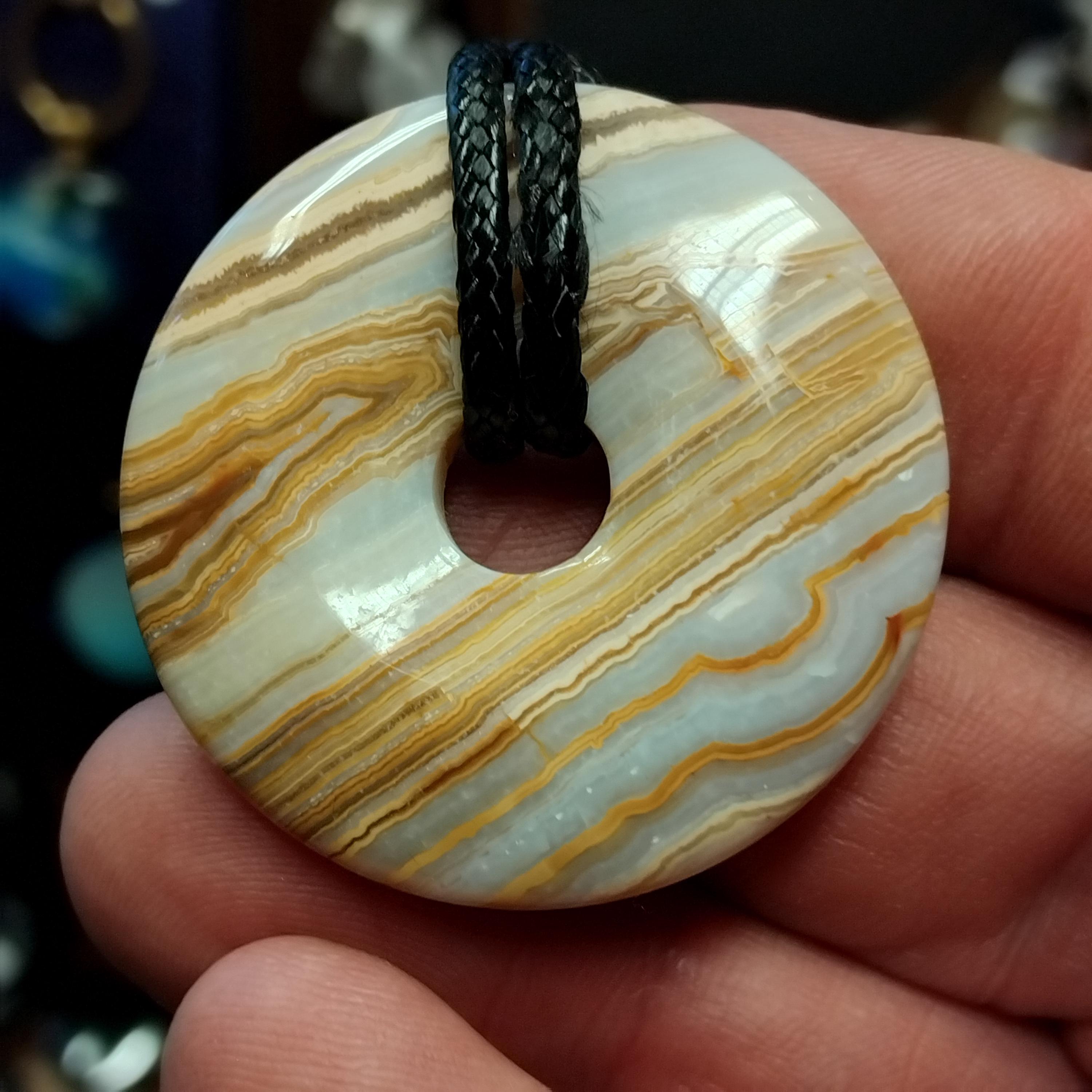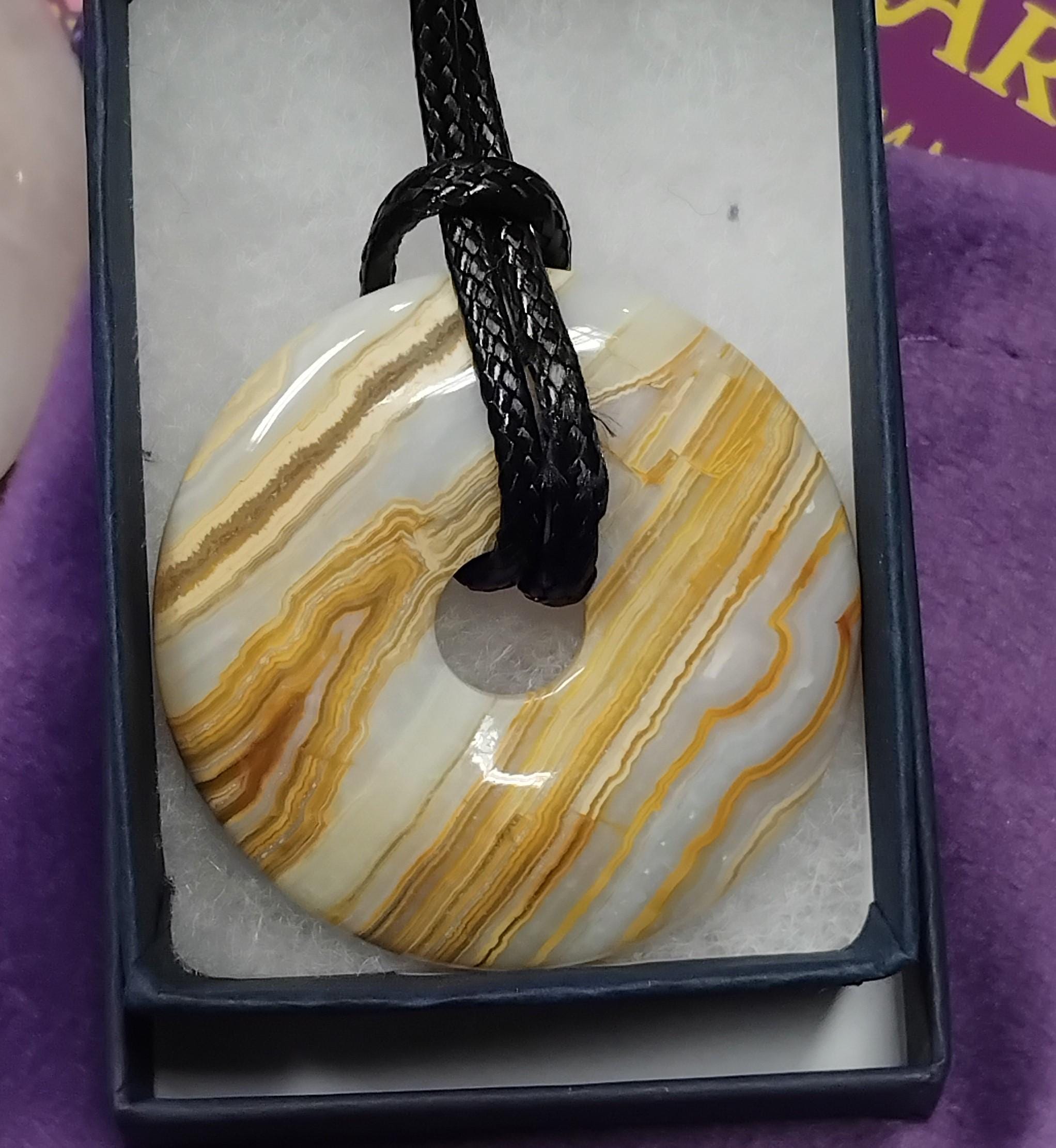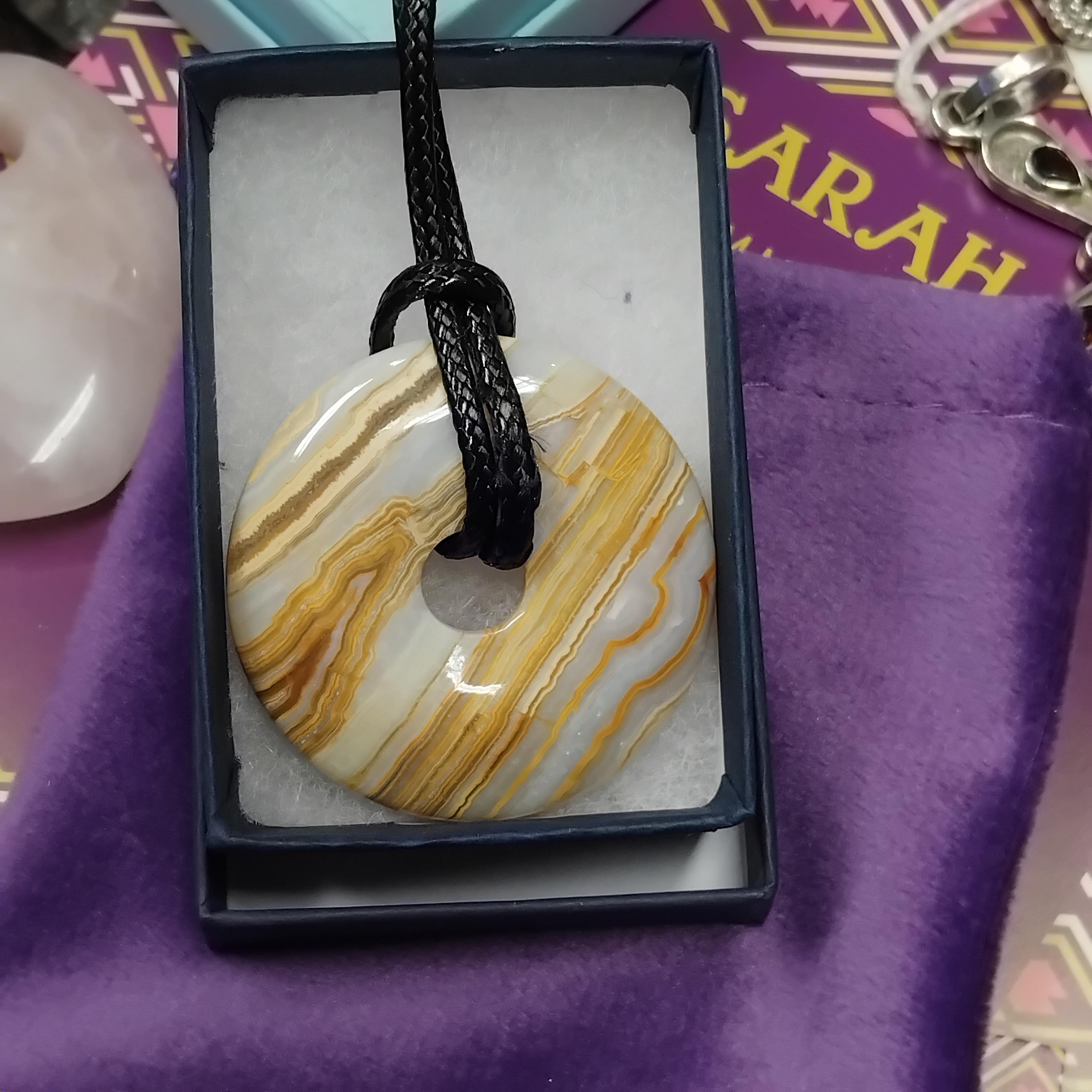 Yellow Lace Agate-Donut -40 mm- Black Cord-Gift-Yourself-Friends-Family-Loved One- NEW- Gift Box
