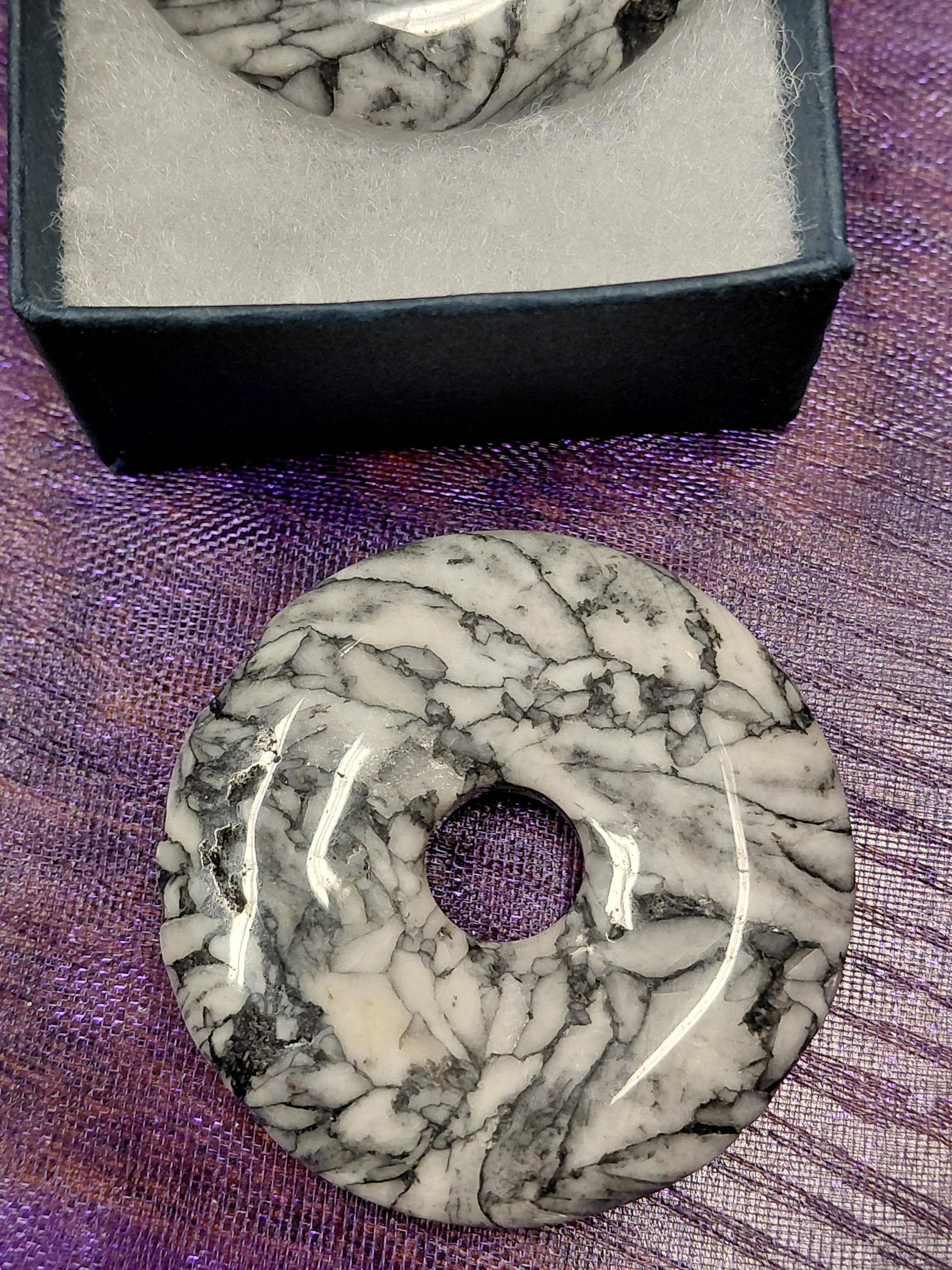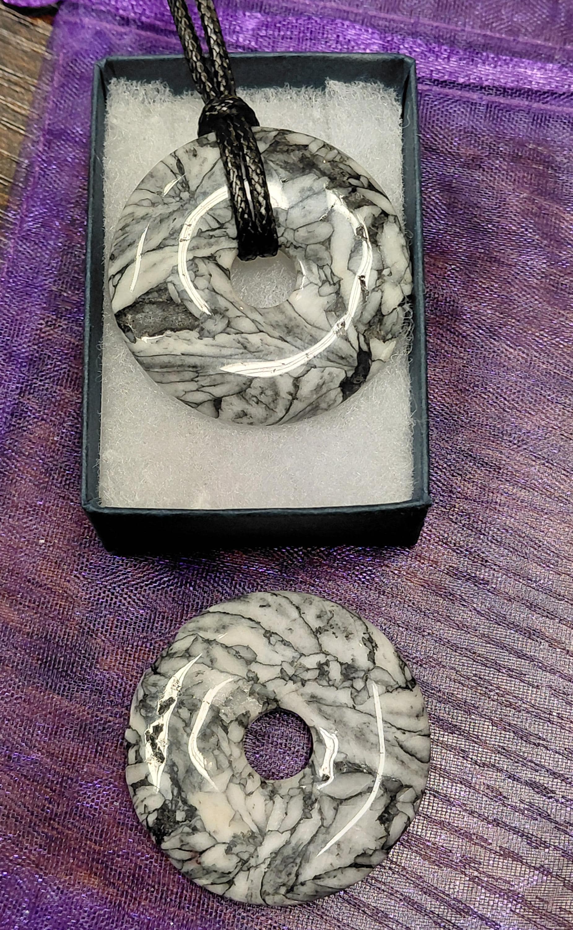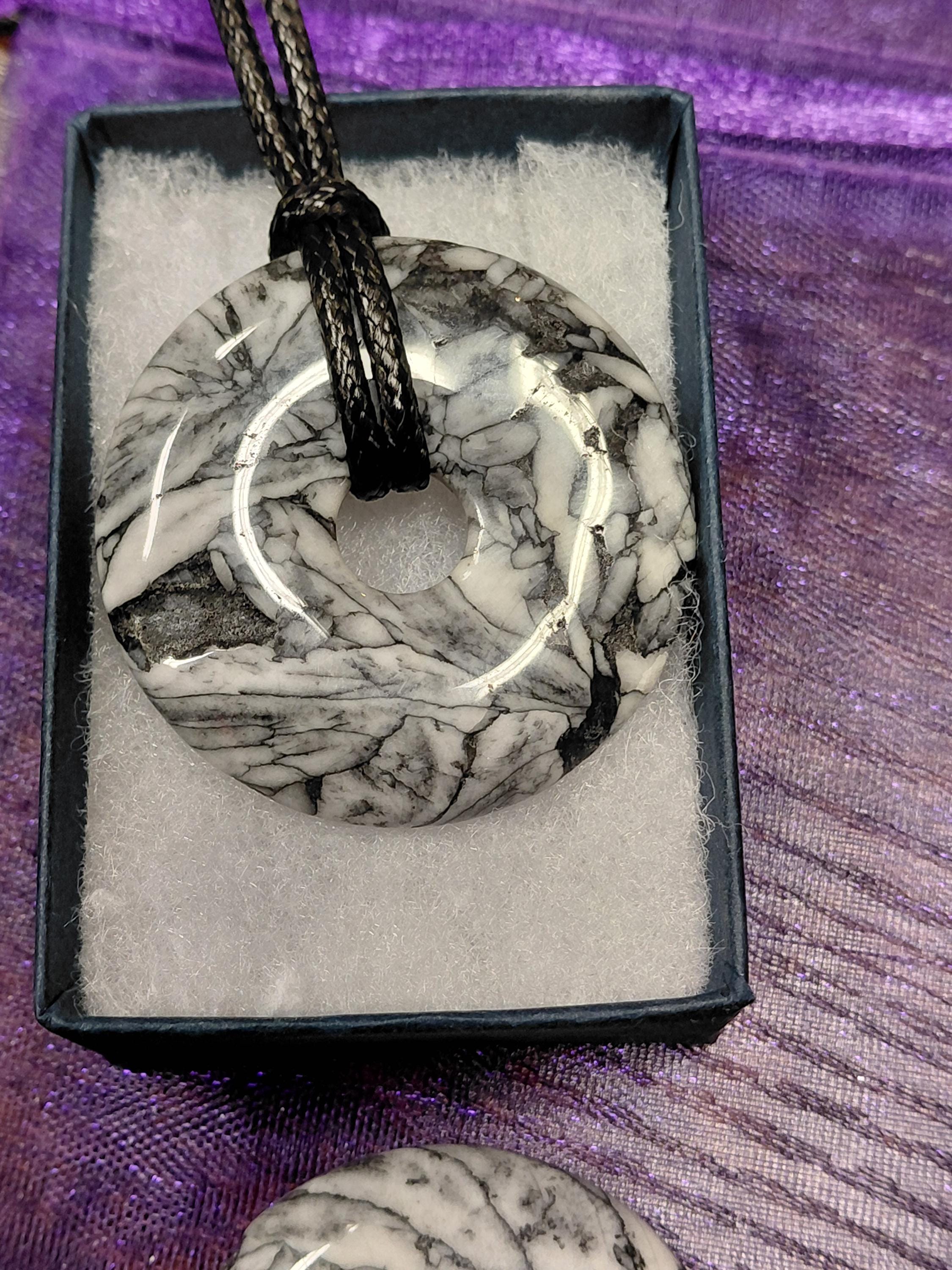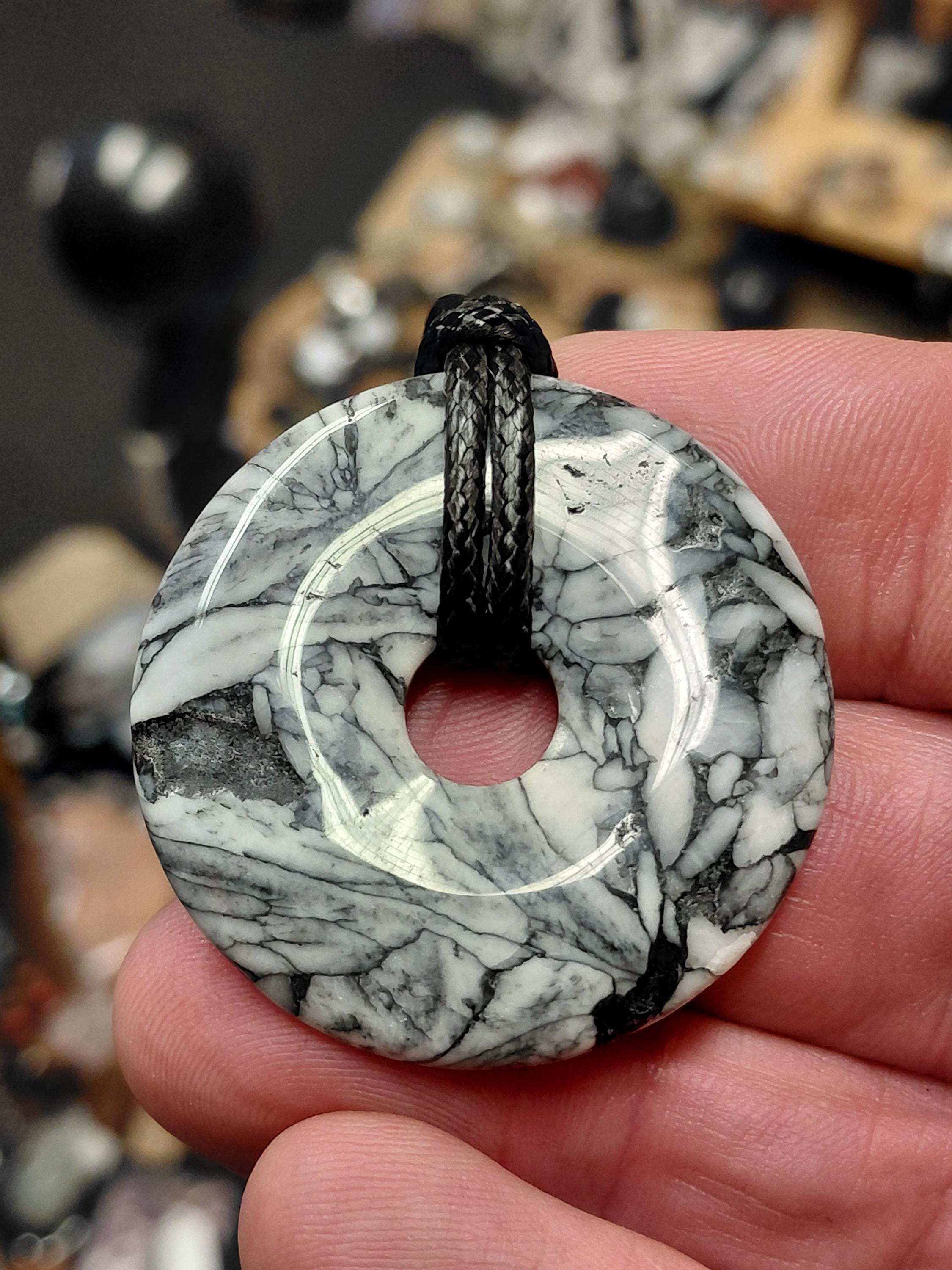 Donut pinolite -ice flower magnesite- 40 mm Pendant with Black Cord