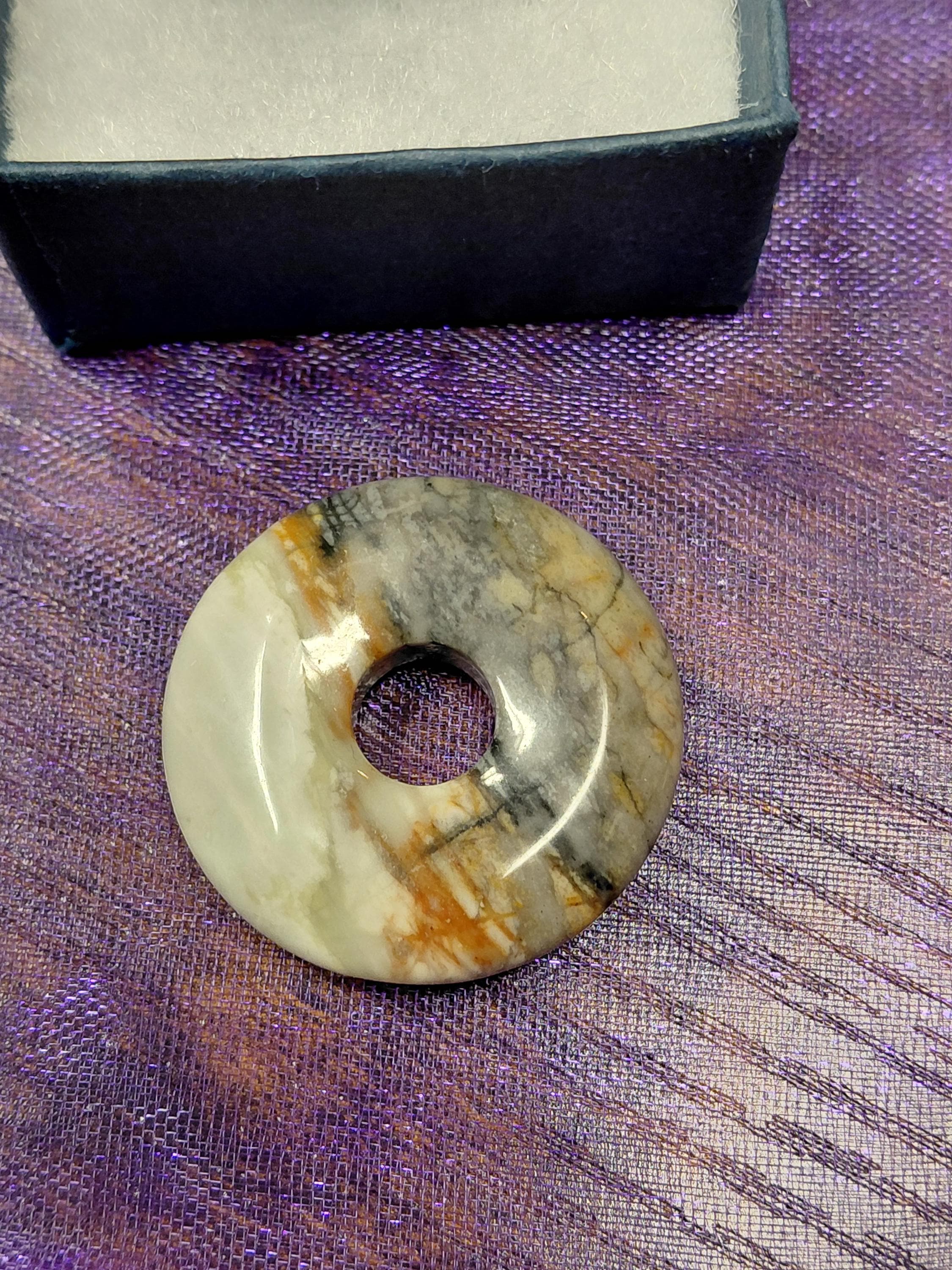 The stripes of Picasso Marble look like the strokes of the painter Pablo Picasso in a painting and gave the mineral, also known as Picasso jasper, its name. The donuts come in different colors from light beige to grey and have individual patterns.