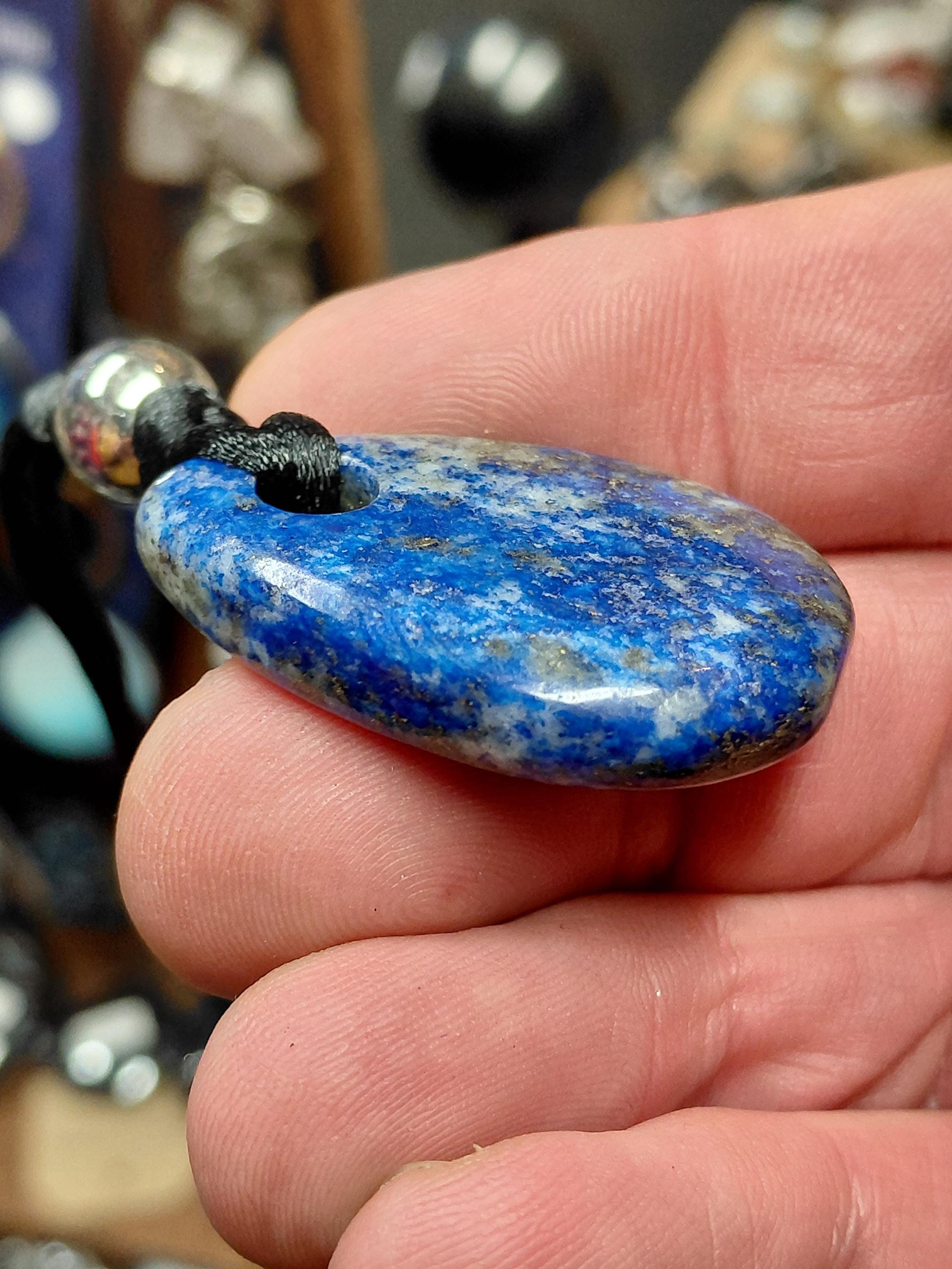 The drilled Lapis Lazuli is approx. 3 cm in size and, thanks to its flat shape, lies particularly well on the skin and can also be worn under clothing, for example.