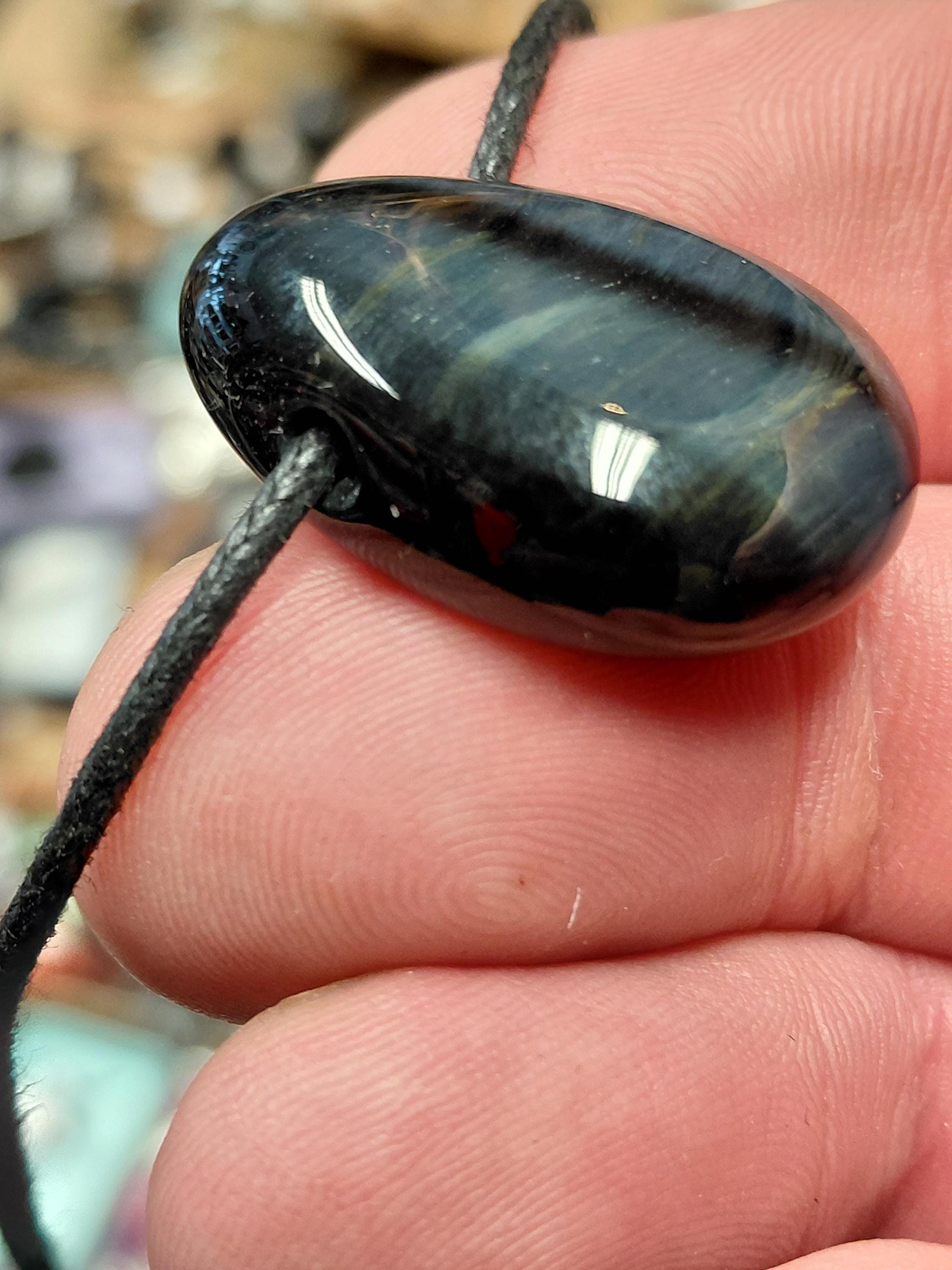 Blue Tigers Eye Drop Pendant - Black Cord Necklace - Gift Box