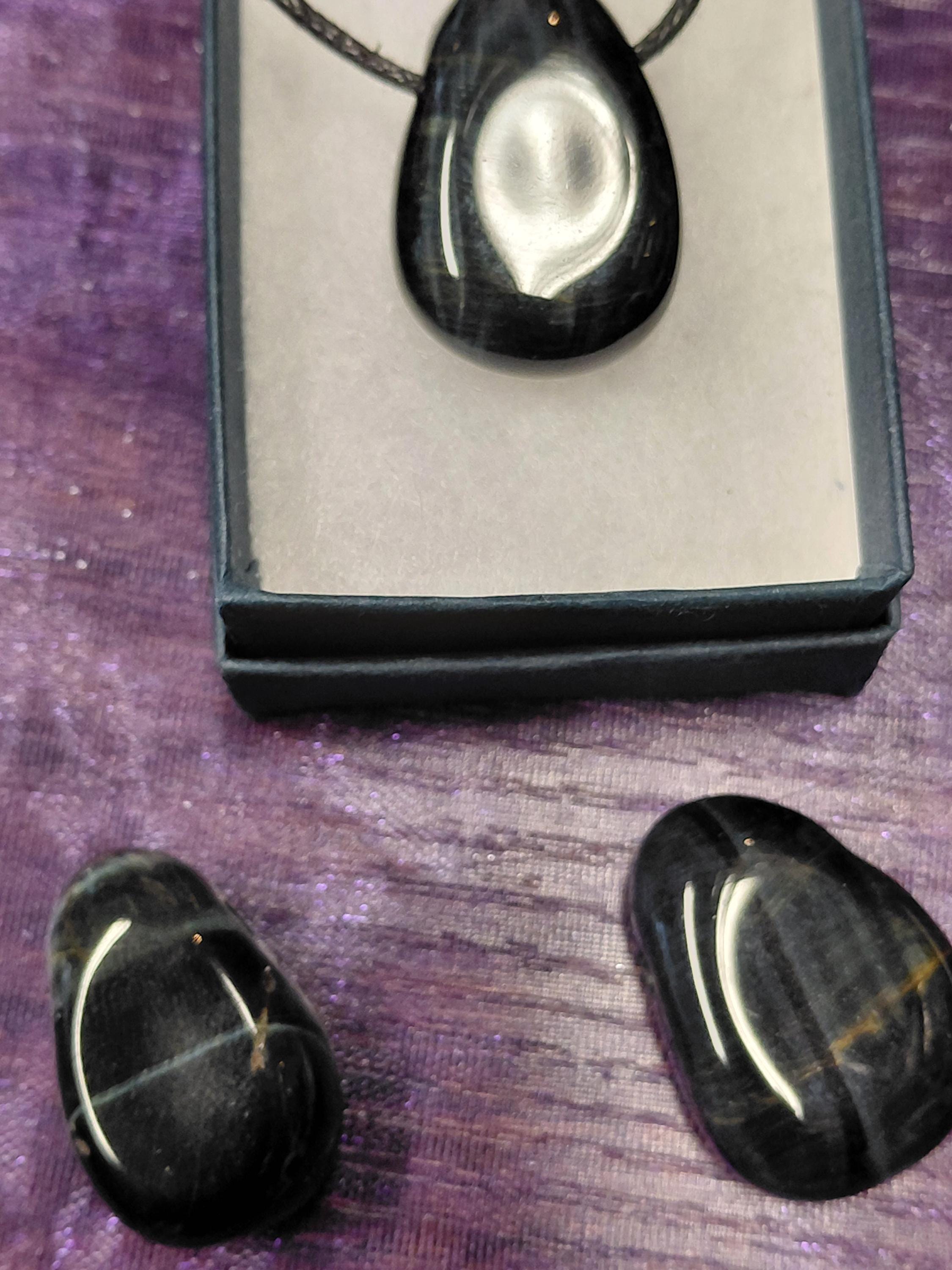 Blue Tiger's Eye, or Hawk's Eye, is a calming, protective stone that enhances communication, mental clarity, and intuition. It directly activates the Throat and Third Eye chakras to help release stress, sharpen focus, and provide perspective. It is ideal for promoting emotional balance, reducing anxiety, and aiding in clear decision-making.